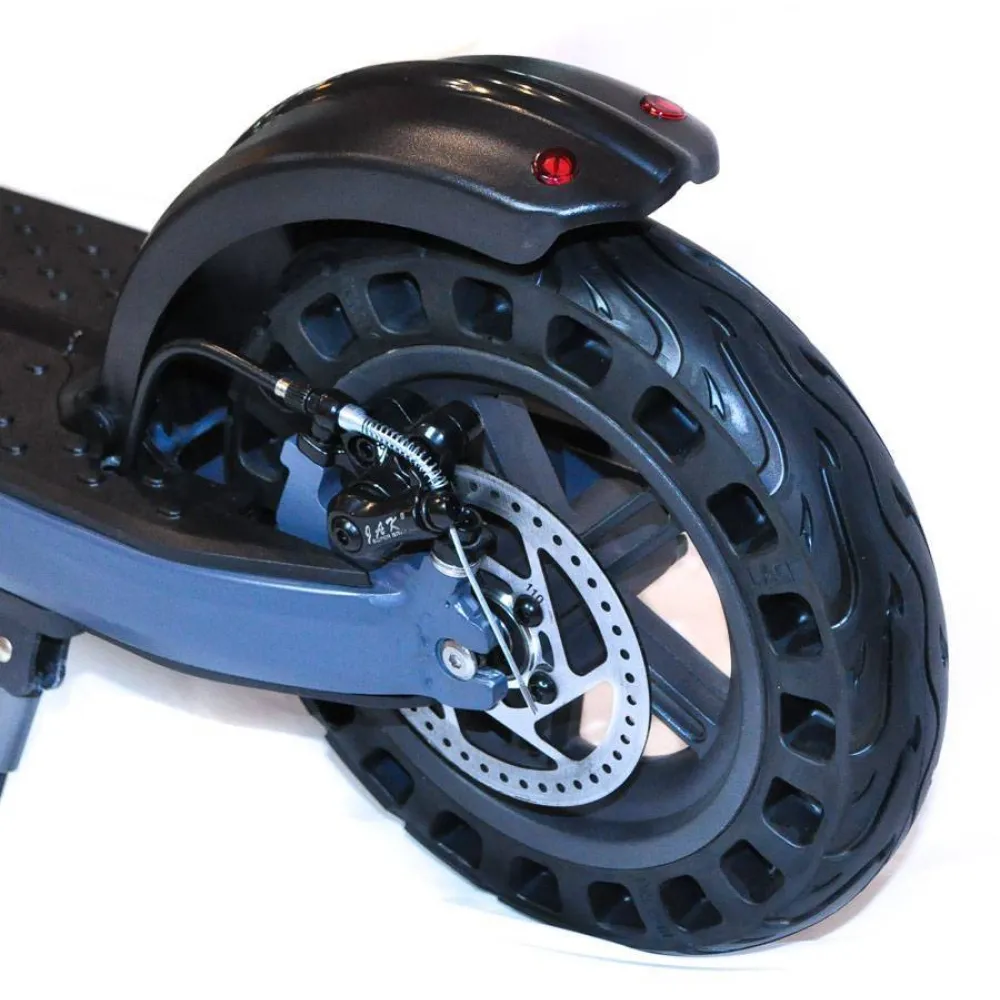 Диаметр колес электросамоката составляет 10 дюймов, что обеспечивает плавный ход при поездке по дорожным покрытиям различного типа. Вы с легкостью будете проходить через такие препятствия, как трещины и неровности асфальта, невысокие бордюры, а также «лежачих полицейских».