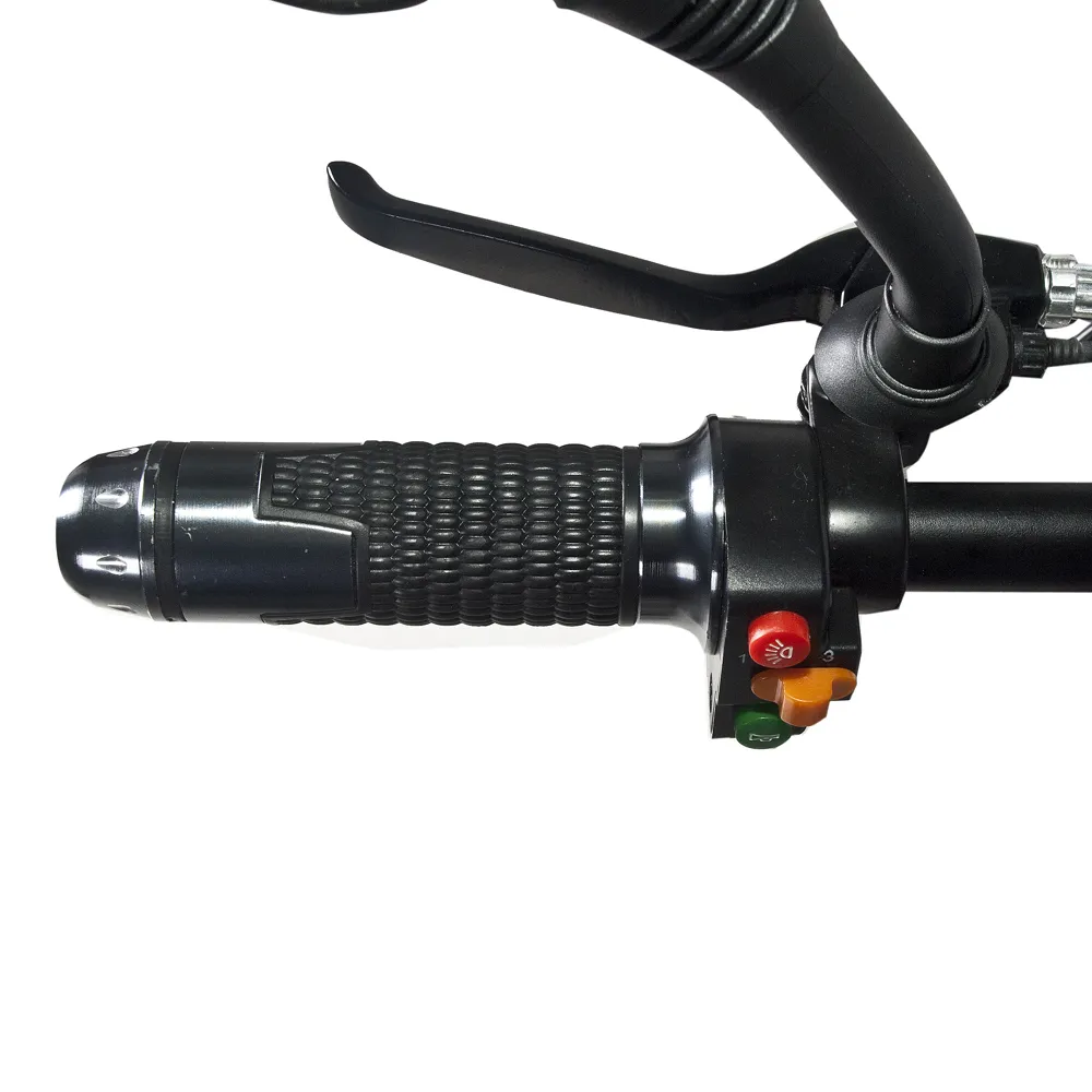 Алюминиевая рама выдерживает максимальные нагрузки, не деформируется при езде в жестких условиях. Наличие зеркал заднего вида, фирменной тормозной системы (дисковой), звукового сигнала и фар гарантирует безопасное движение в вечернее время и непогоду.