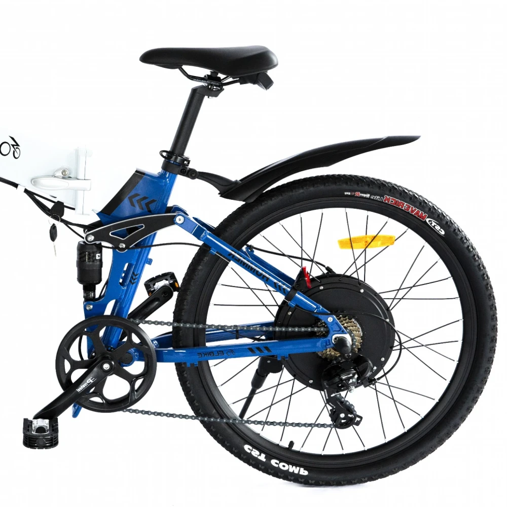 Электровелосипед Elbike HUMMER ELITE 13 Синий – выглядит круто на фоне другой, аналогичной техники. Рама выглядит массивно и современно за счет брендовой надписи и наличия в ней емкой батареи. 26 дюймовые колеса с цепкими покрышками предназначены для езды по бездорожью и другой проблематичной местности. Также техника может использоваться в качестве ежедневного варианта.